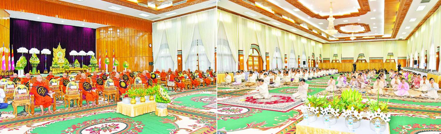 ယင်းနောက် အခမ်းအနားကို နမောတဿသုံးကြိမ်ရွတ်ဆိုဘုရားကန်တော့ ဖွင့်လှစ်၍ နိုင်ငံတော်စီမံအုပ်ချုပ်ရေးကောင်စီဥက္ကဋ္ဌ တပ်မတော်ကာကွယ်ရေးဦးစီးချုပ်နှင့် ဇနီး၊ အခမ်းအနားတက်ရောက်လာကြသူများက နိုင်ငံတော်သံဃမဟာနာယကအဖွဲ့ဥက္ကဋ္ဌ သန်လျင်မင်းကျောင်းဆရာတော်ကြီးထံမှ ကိုးပါးသီလခံယူဆောက်တည်ကြပြီး ဆရာတော်ကြီးများ ရွတ်ပွားချီးမြှင့်တော်မူသည့် မေတ္တသုတ်ပရိတ်တရားတော်များကို နာယူကြည်ညိုကြသည်။