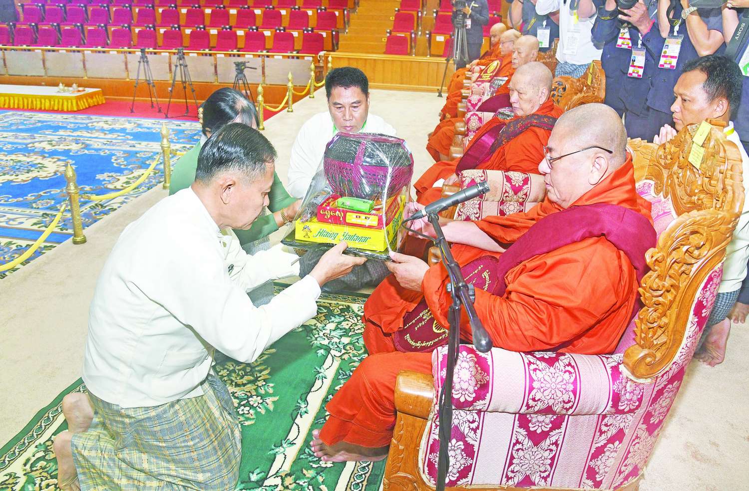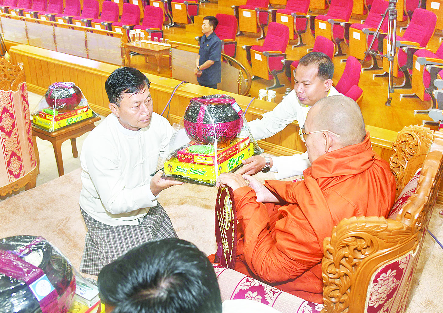 ယင်းနောက် နိုင်ငံတော်စီမံအုပ်ချုပ်ရေးကောင်စီဒုတိယဥက္ကဋ္ဌ ဒုတိယဝန်ကြီးချုပ်နှင့် ဇနီးတို့က မစိုးရိမ်တိုက်သစ်ဆရာတော်ကြီးထံ ဝါဆိုသင်္ကန်းနှင့် လှူဖွယ်ပစ္စည်းများကို ဆက်ကပ်လှူဒါန်းသည်။ ဆက်လက်၍ ကောင်စီအတွင်းရေးမှူးနှင့်ဇနီး၊ တွဲဖက်အတွင်းရေးမှူးနှင့်ဇနီး၊ ကောင်စီဝင်များနှင့်ဇနီးများ၊ ပြည်ထောင်စုအဆင့်ပုဂ္ဂိုလ်များက ဆရာတော်၊ သံဃာတော်များထံ ဝါဆိုသင်္ကန်းနှင့် လှူဖွယ်ပစ္စည်းများကို အသီးသီးဆက်ကပ်လှူဒါန်းကြသည်။
