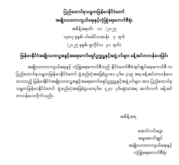 မြန်မာနိုင်ငံအမျိုးသားလူ့အခွင့်အရေးကော်မရှင်ဥက္ကဋ္ဌနှင့် အဖွဲ့ဝင်များ ခန့်အပ်တာဝန်ပေးခြင်း 07/31/2025