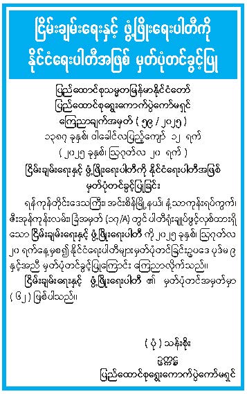 ငြိမ်းချမ်းရေးနှင့် ဖွံ့ဖြိုးရေးပါတီကို နိုင်ငံရေးပါတီအဖြစ် မှတ်ပုံတင်ခွင့်ပြုခြင်း