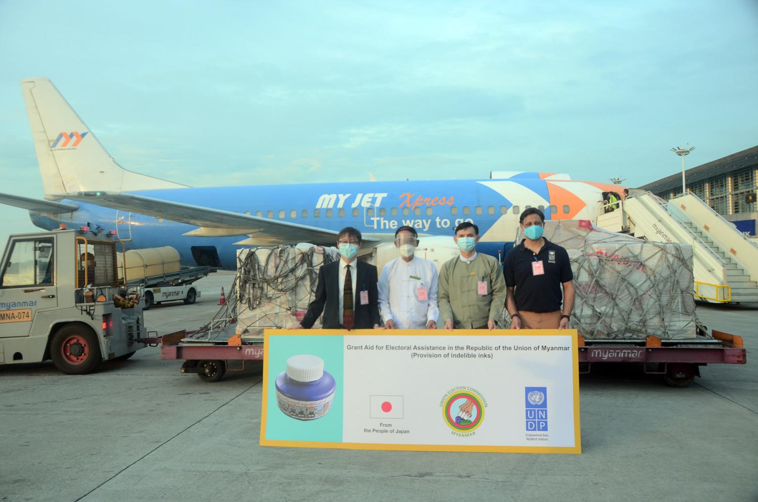 အဆိုပါ ရွေးကော်ပွဲဆိုင်ရာ အထောက်အကူပြု ပစ္စည်းများအား ဂျပန်အစိုးရနှင့် ပြည်သူများ၏ ငွေကြေးထောက်ပံ့မှု၊ ကုလသမဂ္ဂဖွံ့ဖြိုးမှုအစီအစဉ် (UNDP) ၏ ကူညီမှု အစီအစဉ်တို့ဖြင့် ဆောင်ရွက်ခြင်းဖြစ်ပြီး လေကြောင်းခရီးဖြင့် သုံးကြိမ်ပို့ဆောင် လှူဒါန်း သွားမည်ဖြစ်ရာ ယနေ့တွင် ပထမဆုံး ခရီးစဉ်အဖြစ် ရောက်ရှိလာခြင်း ဖြစ်သည်။