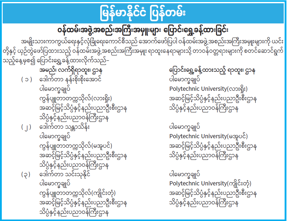ဝန်ထမ်းအဖွဲ့အစည်းအကြီးအမှူးများ ပြောင်းရွှေ့ခန့်ထားခြင်း