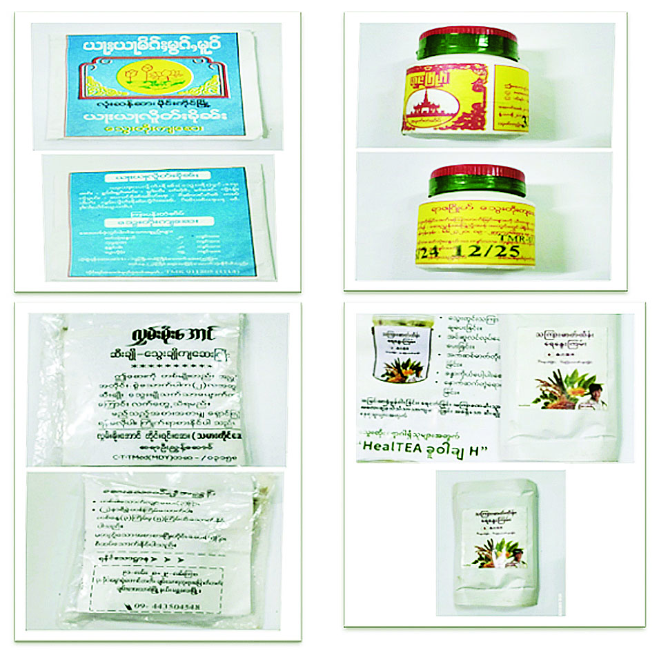 ၂။ ယင်းသို့စစ်ဆေးရာတွင် ဈေးကွက်အတွင်း ရောင်းချလျက်ရှိသော လုံးဆန်ဆာ ကြာပန်းအမှတ် တံဆိပ်သွေးတိုးကျဆေးနှင့် ရာဇဂြိုဟ်အမှတ်တံဆိပ် သွေးတိုးကျဆေးတို့သည် တိုင်းရင်းဆေးဝါးမှတ်ပုံ တင်ရရှိခဲ့သော်လည်း ထုတ်လုပ်ခွင့်လိုင်စင် လျှောက်ထားမှုမရှိခြင်း၊ တိုင်းရင်းဆေးဝါး မှတ်ပုံတင်သက်တမ်းကုန်ဆုံးခြင်း၊ လွှမ်းမိုးအောင်အမှတ်တံဆိပ် သွေးချိုဆီးချိုကျဆေးကြီးနှင့် သကြားဓာတ်ထိန်းရေနွေးကြမ်းတို့သည် တိုင်းရင်းဆေးဝါး မှတ်ပုံတင်ထားခြင်းမရှိခြင်းတို့ကြောင့် ၎င်းတိုင်းရင်း ဆေးဝါး (၄) မျိုးသည် တိုင်းရင်းဆေးဝါးမှတ်ပုံတင် မရှိသောတိုင်းရင်းဆေးဝါးများဖြစ်သဖြင့် ဆေးဝါးစစ်မှန်အစွမ်းထက်မှုကို အာမခံချက်မပေးနိုင်သောကြောင့် အများပြည်သူများသုံးစွဲရန်မသင့်ကြောင်း အသိပေးအပ်ပါသည်။