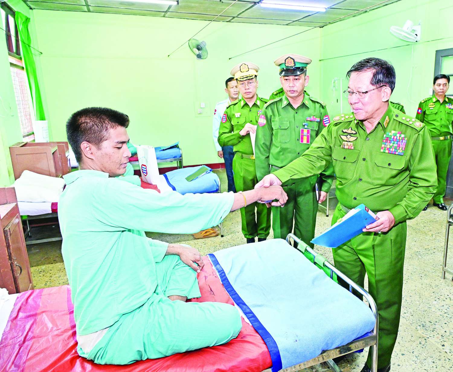 ယင်းနောက် နိုင်ငံတော်လုံခြုံရေးနှင့် အေးချမ်းသာယာရေးကော်မရှင်ဥက္ကဋ္ဌ တပ်မတော်ကာကွယ်ရေးဦးစီးချုပ်သည် တပ်နယ်ရှိ နယ်မြေခံတပ်မတော်ဆေးရုံတွင် တက်ရောက်ကုသလျက်ရှိသည့် နိုင်ငံတော်ကာကွယ်ရေးနှင့် လုံခြုံရေးတာဝန်များ ထမ်းဆောင်စဉ် ထိခိုက်ဒဏ်ရာရရှိခဲ့သော အရာရှိ၊ စစ်သည်များအား ထိခိုက်ဒဏ်ရာရရှိခဲ့မှု အခြေအနေများ၊ ရောဂါကုသပျောက်ကင်းမှု အခြေအနေများကို တစ်ဦးချင်းလိုက်လံတွေ့ဆုံ၍ ရင်းနှီးနွေးထွေးစွာ မေးမြန်းပြီး အားပေးစကားပြောကြားကာ အရာရှိ၊ စစ်သည်များ၏ တင်ပြချက်များအပေါ် လိုအပ်သည်များ ဖြည့်ဆည်းဆောင်ရွက်ပေးသည်။