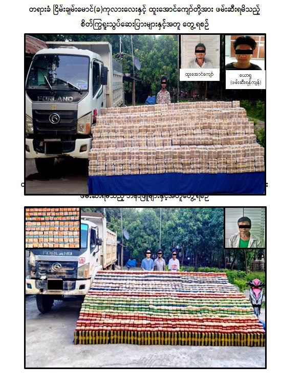 ဖမ်းဆီးရမိမှုဖြစ်စဉ်တွင် စိတ်ကြွရူးသွပ်ဆေးပြား ၆၅ ဒသမ ၂ သိန်း (၎င်းဒေသ တန်ဖိုးငွေကျပ် ၁၃ ဒသမ ၀၄ ဘီလီယံ) နှင့် ဘိန်းဖြူ ၂၉ ဒသမ ၂၃ ကီလို (၎င်းဒေသတန်ဖိုးငွေကျပ် ၁ ဒသမ ၄၆၁၅ ဘီလီယံ)၊ စုစုပေါင်း ၎င်းဒေသတန်ဖိုးငွေကျပ် ၁၄ ဒသမ ၅၀၁၅ ဘီလီယံအား ဖမ်းဆီးရမိခဲ့ခြင်း ဖြစ်ကြောင်း၊