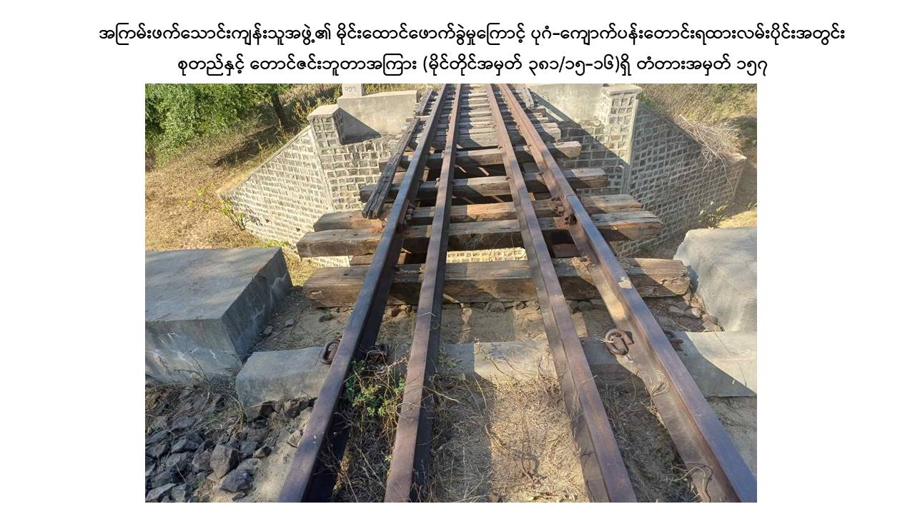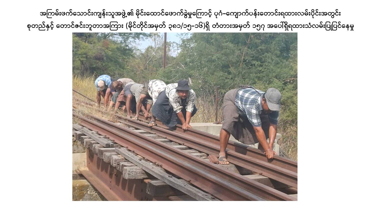 အကြမ်းဖက်သောင်းကျန်းသူအဖွဲ့များအနေဖြင့် ၂၀၂၁ ခုနှစ်၊ ဖေဖော်ဝါရီလမှစ၍ ယခုအချိန်အထိ မြန်မာ့မီးရထားလမ်းကွန်ရက်တစ်ခုလုံးတွင် ရထားလမ်းနှင့် ရထားဘူတာနယ်မြေအတွင်း မိုင်းထောင်ဖောက်ခွဲဖျက်ဆီးခြင်း(၈၃)ကြိမ်၊ ရထားတံတား/ သံလမ်းများအား မိုင်းထောင်ဖောက်ခွဲဖျက်ဆီးခြင်း(၁၇၉)ကြိမ်၊ ဘူတာအဆောက်အဦနှင့် ဝန်ထမ်းနေအိမ်များအား မီးရှို့ဖျက်ဆီးခြင်း(၁၆)ကြိမ်ကျူးလွန်ခဲ့ကြပြီး နိုင်ငံတော်ပိုင်ရထားစက်ခေါင်းနှင့် တွဲများ၊ ရထားလမ်းနှင့် တံတားများ၊ ခရီးသည်များနှင့် ကုန်စည်များ ထိခိုက်ပျက်စီးဆုံးရှုံးစေရေး၊ ရထားစီးခရီးသွားပြည်သူများအနေဖြင့် ရထားဖြင့်ခရီးသွားလာရာတွင် ကိုယ်စိတ်နှလုံးချမ်းမြေ့ပြီး အသက်အန္တရာယ်ကင်းရှင်းစွာဖြင့် လုံခြုံစိတ်ချစွာသွားလာနိုင်မှုမရှိစေရေးအတွက် ရည်ရွယ်ပြီး ယခုကဲ့သို့ အကြိမ်ကြိမ်ကျူးလွန်ဖျက်ဆီးနေကြခြင်းဖြစ်သော်လည်း နိုင်ငံတော်အစိုးရအနေဖြင့် အများပြည်သူခရီးသွားလာမှုနှင့် ကုန်စည်ပို့ဆောင်မှုအဆင်ပြေချောမွေ့မြန်ဆန်စေရေးအတွက် ရထားလမ်းနှင့်အခြေခံအဆောက်အဦများ ပိုမိုတိုးတက်ကောင်းမွန်လာစေရေးနှင့် ရထားပို့ဆောင်ရေးစနစ် အဆင့်မြှင့်တင်ရေးစီမံကိန်းလုပ်ငန်းများကို ရည်မှန်းချက်ထားရှိ၍ အစဉ်တစိုက်အလေးထား စီမံဆောင်ရွက်ပေးလျက်ရှိကြောင်း သတင်းရရှိသည်။