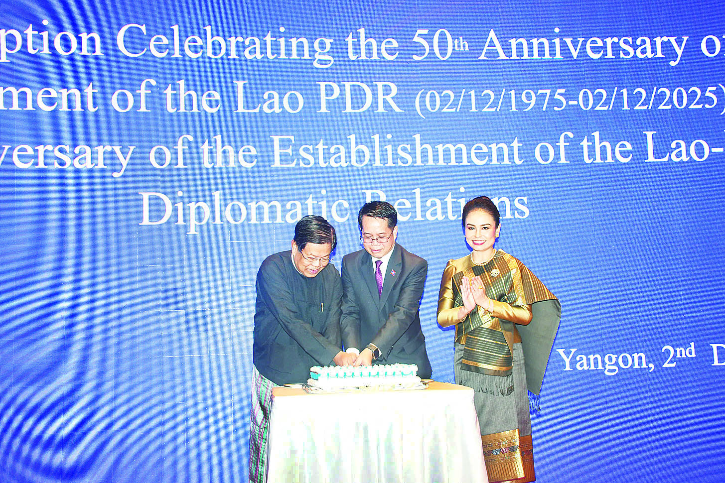 ဆက်လက်၍ ပြည်ထောင်စုဝန်ကြီးနှင့် မြန်မာနိုင်ငံဆိုင်ရာ လာအိုပြည်သူ့ဒီမိုကရက်တစ်သမ္မတ နိုင်ငံသံအမတ်ကြီးတို့က လာအိုပြည်သူ့ဒီမိုကရက်တစ်သမ္မတနိုင်ငံ တည်ထောင်သည့် နှစ်(၅၀)ပြည့်နှစ်ပတ်လည်နှင့် မြန်မာ-လာအို နှစ်နိုင်ငံအကြား သံတမန်ဆက်ဆံရေးထူထောင်မှု နှစ်(၇၀)ပြည့် နှစ်ပတ်လည်အထိမ်းအမှတ်ကိတ်ကို လှီးဖြတ်ပေးပြီး ဧည့်ခံပွဲအခမ်းအနားသို့ တက်ရောက်လာကြသူများနှင့်အတူ စုပေါင်းမှတ်တမ်းတင် ဓာတ်ပုံရိုက်ကြသည်။