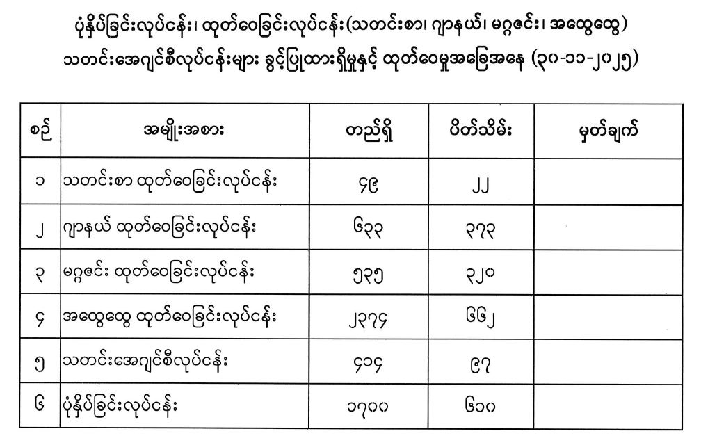 ပုံနှိပ်ခြင်းလုပ်ငန်း၊ ထုတ်ဝေခြင်းလုပ်ငန်း (သတင်းစာ၊ ဂျာနယ်၊ မဂ္ဂဇင်း၊ အထွေထွေ) သတင်းအေဂျင်စီလုပ်ငန်းများ ခွင့်ပြုထားရှိမှုနှင့် ထုတ်ဝေမှုအခြေအနေ (၃၀-၁၁-၂၀၂၅) 12/05/2025