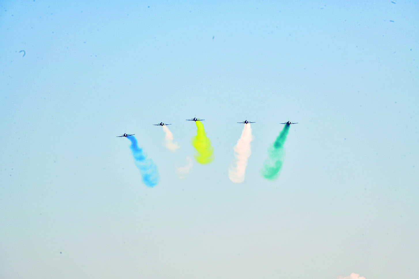 ထို့နောက် လေယာဉ်၊ ရဟတ်ယာဉ်များ သရုပ်ပြအုပ်ဖွဲ့ပျံသန်းအလေးပြုခြင်းနှင့် စွမ်းရည်ပြသခြင်းများကို ဆောင်ရွက်ရာ Mi-17 ရဟတ်ယာဉ် ၄ စီးက Arrow Head Formation ပုံစံဖြင့်လည်းကောင်း၊ Bell 206 ရဟတ် ယာဉ် ၂ စီး၊ H-125 ရဟတ်ယာဉ် ၂ စီး၊ H - 120 ရဟတ်ယာဉ် ၂ စီးတို့က Composite Formation ပုံစံဖြင့်လည်းကောင်း၊ MTX-1B ကင်းထောက်လေယာဉ် ၁ စီးနှင့် Grob-120 TP အမောင်းသင်လေယာဉ် ၃ စီးတို့က Composite Formation ပုံစံဖြင့်လည်းကောင်း၊ K-8 ဂျက်တိုက်လေယာဉ် ၅ စီးတို့က Kite Formation ပုံစံဖြင့်လည်းကောင်း၊ F - 7 တိုက်လေယာဉ် ၄ စီးက Box Formation ပုံစံဖြင့်လည်းကောင်း၊ MiG-29 ဘက်စုံသုံးဂျက်တိုက်လေယာဉ် ၅ စီးက Arrow Head Formation ပုံစံဖြင့်လည်းကောင်း၊ Su-30 SME ဘက်စုံသုံး အကြီးစားဂျက်တိုက်လေယာဉ် ၂ စီး နှင့် FTC 2000G တိုက်လေယာဉ် ၂ စီးတို့က Composite Formation ပုံစံဖြင့်လည်းကောင်း အသီးသီးသရုပ်ပြပျံသန်းကြသည်။ ဆက်လက်ပြီး MiG-29 ဘက်စုံသုံးဂျက်တိုက်လေယာဉ်များနှင့် စတုတ္ထမျိုးဆက်လွန် ဘက်စုံသုံးအကြီးစားတိုက်လေယာဉ်ဖြစ်သည့် Su-30 SME တိုက်လေယာဉ်များက အဆင့်မြင့်လှုပ်ရှားစစ်ကစားမှု (High Performance Maneuver) များအား စွမ်းရည်ပြပျံသန်းခြင်းများကို ဆောင်ရွက်သည်။