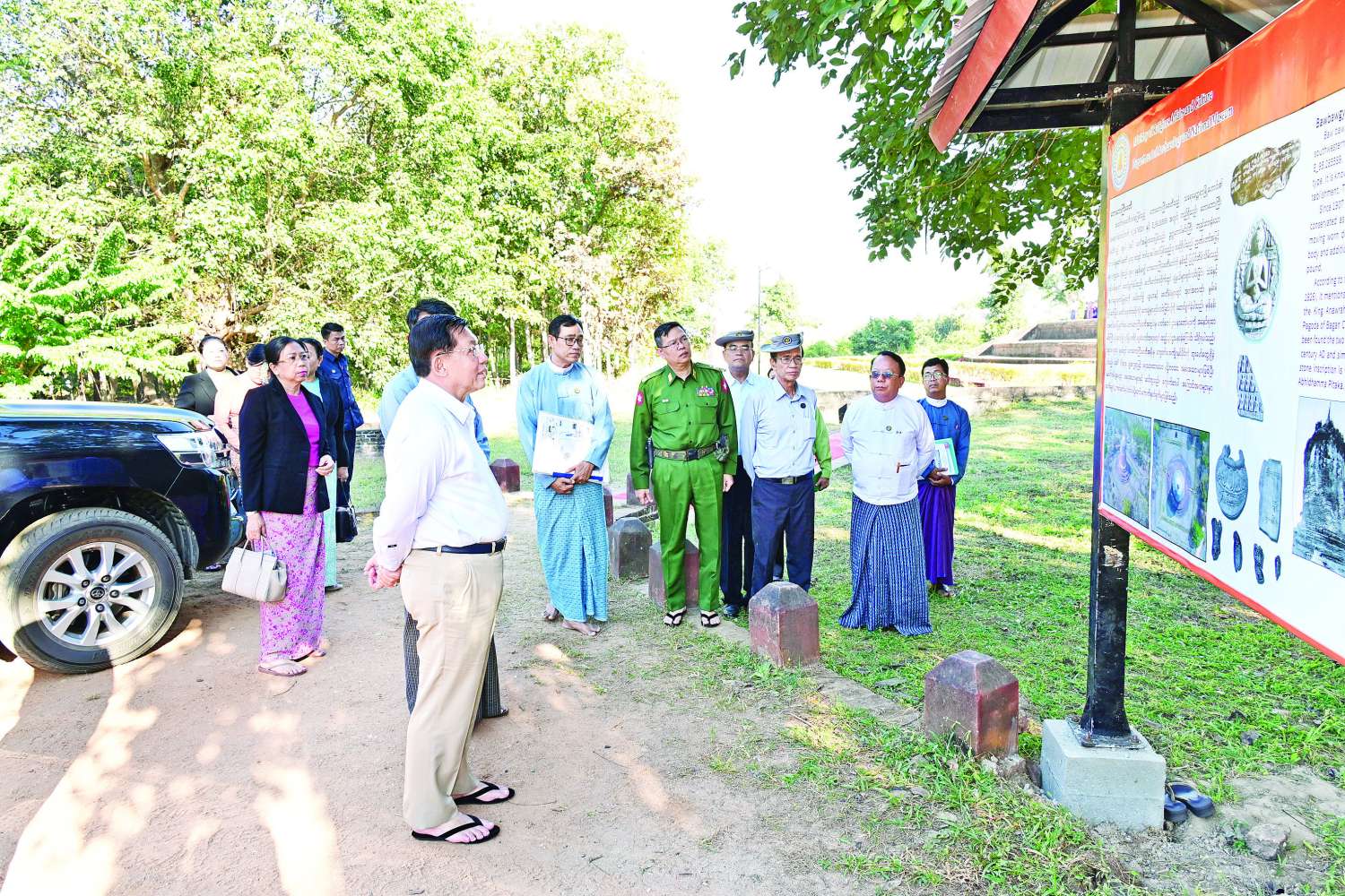ယင်းနောက် နိုင်ငံတော်ယာယီသမ္မတ နိုင်ငံတော်လုံခြုံရေးနှင့်အေးချမ်းသာယာရေးကော်မရှင်ဥက္ကဋ္ဌနှင့် ဇနီး၊ အဖွဲ့ဝင်များသည် သရေခေတ္တရာမြို့ဟောင်း၏ အနောက်တောင်ဘက်ရှိ ဒွတ္တဘောင်မင်းကြီးတည်ထားခဲ့သော ရှေးဟောင်းသမိုင်းဝင် အထင်ကရစေတီတစ်ဆူဖြစ်သည့် ဘောဘောကြီးစေတီသို့ရောက်ရှိကြရာ သာသနာရေးနှင့်ယဉ်ကျေးမှုဝန်ကြီးဌာန၊ ရှေးဟောင်းသုတေသနနှင့် အမျိုးသားပြတိုက်ဦးစီးဌာနမှ တာဝန်ရှိသူများက စေတီတော်ကြီးအား ရှေးမူလက်ရာမပြတ် ထိန်းသိမ်းထားရှိမှုအခြေအနေများကို ရှင်းလင်းတင်ပြသည်။