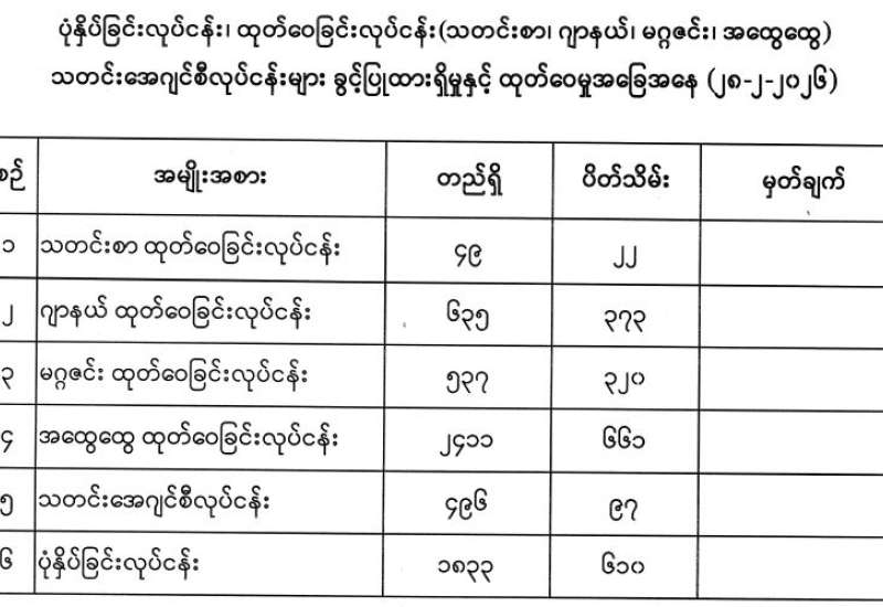 ထို့အတူ စက်သုံးဆီဖူလုံမှုအတွက် စဉ်ဆက်မပြတ် တင်သွင်းလျက်ရှိရာ ယနေ့တွင် သင်္ဘောတင်သွင်းရောက်ရှိမှုအခြေအနေမှာ သီလဝါဆိပ်ကမ်းတွင်ဆိုက်ကပ်ပြီး သင်္ဘောနှစ်စင်း၊ လမ်းခရီးတွင် သင်္ဘောလေးစင်း၊ ဆီတင်လျက်ရှိသည့် သင်္ဘောသုံးစင်းနှင့် ဆီတင်ရန်စောင့်ဆိုင်းလျက်ရှိသည့် သင်္ဘောငါးစင်းဖြစ်ကြောင်း သတင်းရရှိသည်။