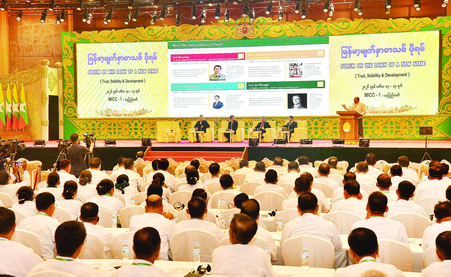 “မြန်မာ့မျက်နှာစာသစ်ဖိုရမ်” (ယုံကြည်မှု၊ တည်ငြိမ်အေးချမ်းမှုနှင့် ဖွံ့ဖြိုးတိုးတက်မှု) “Forum on The Dawn of A New State”(Trust, Stability & Development) ပထမနေ့ကို ယနေ့တွင် နေပြည်တော်ရှိ မြန်မာအပြည်ပြည်ဆိုင်ရာကွန်ဗင်းရှင်းဗဟိုဌာန (၁) (MICC I) ၌ ကျင်းပသည်။