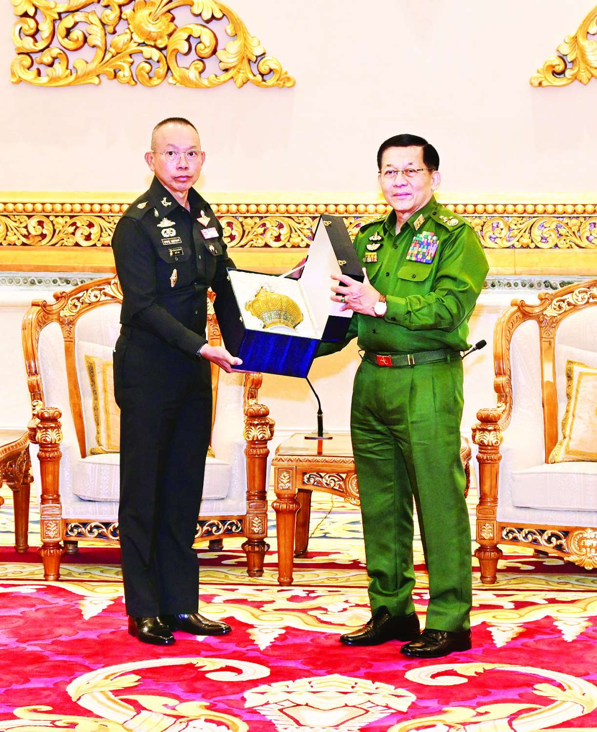 နိုင်ငံတော်လုံခြုံရေးနှင့်အေးချမ်းသာယာရေးကော်မရှင်ဥက္ကဋ္ဌ တပ်မတော်ကာကွယ်ရေးဦးစီးချုပ် ဗိုလ်ချုပ်မှူးကြီး မင်းအောင်လှိုင်သည် ထိုင်းဘုရင့်တပ်မတော် ကာကွယ်ရေးဦးစီးချုပ် General Ukris Boontanondha ဦးဆောင်သည့် ကိုယ်စားလှယ်အဖွဲ့အား ယနေ့နံနက်ပိုင်းတွင် နေပြည်တော်ရှိ ဇေယျာသီရိဗိမာန် ဧည့်ခန်းမဆောင်၌ လက်ခံတွေ့ဆုံသည်။