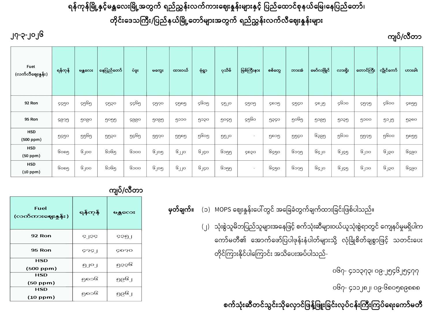 ရန်ကုန်မြို့နှင့် မန္တလေးမြို့အတွက် ရည်ညွှန်းလက်ကားဈေးနှုန်းများနှင့် ပြည်ထောင်စုနယ်မြေ နေပြည်တော်၊ တိုင်းဒေသကြီး/ပြည်နယ် မြို့တော်များအတွက် ရည်ညွှန်းလက်လီဈေးနှုန်းများ 03/27/2026