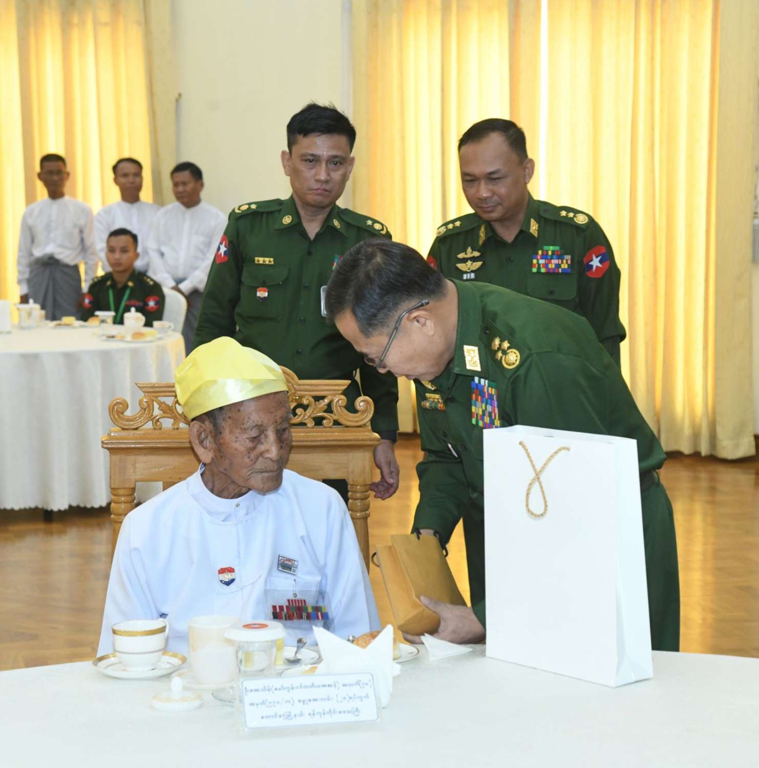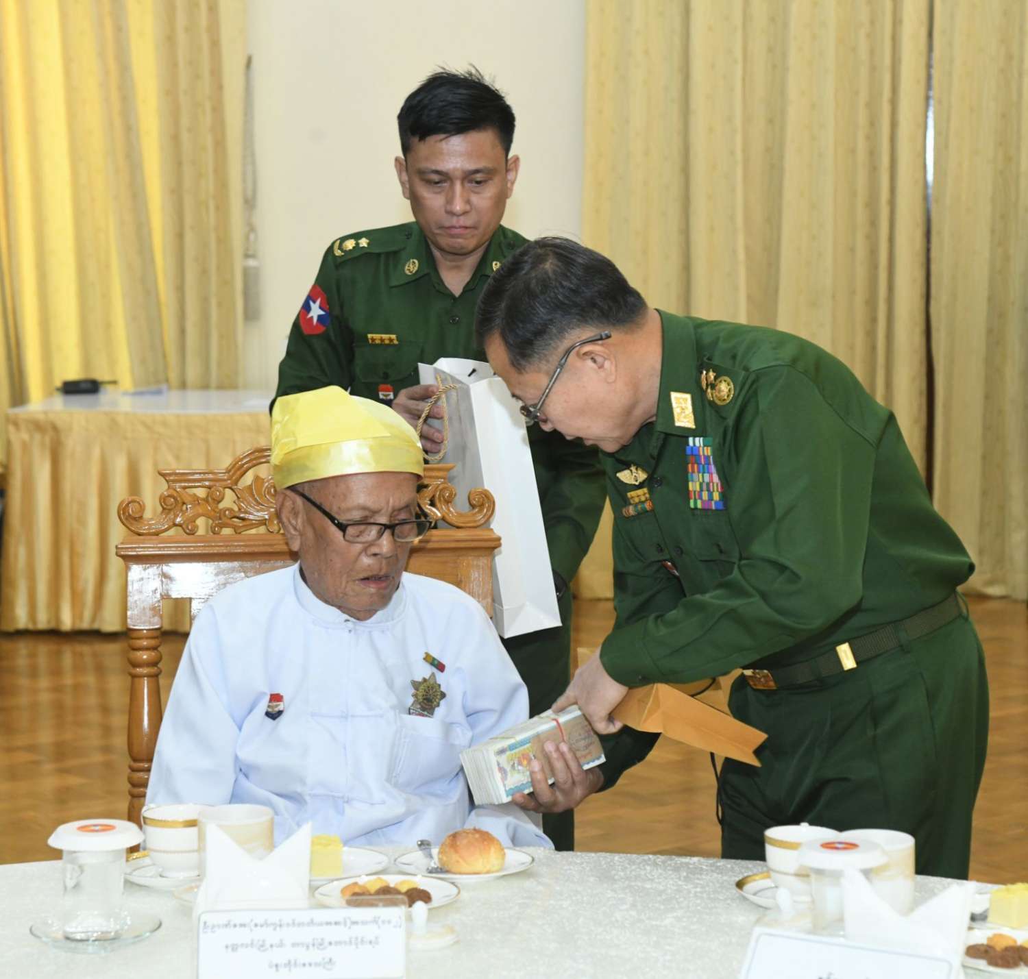 ထိုသို့တွေ့ဆုံစဉ် နိုင်ငံတော်လုံခြုံရေးနှင့် အေးချမ်းသာယာရေးကော်မရှင် ဒုတိယဥက္ကဋ္ဌ ဒုတိယတပ်မတော်ကာကွယ်ရေးဦးစီးချုပ်၊ ကော်မရှင်အတွင်းရေးမှူး ကာကွယ်ရေးဦးစီးချုပ် (ကြည်း) ဗိုလ်ချုပ်ကြီး ရဲဝင်းဦး၊ ကော်မရှင်အဖွဲ့ဝင် ညှိနှိုင်းကွပ်ကဲရေးမှူး (ကြည်း၊ ရေ၊ လေ) ဗိုလ်ချုပ်ကြီး ကျော်စွာလင်းနှင့် ကာကွယ်ရေးဦးစီးချုပ်ရုံးမှ တပ်မတော်အရာရှိကြီးများက လွတ်လပ်ရေးမော်ကွန်းဝင်ပုဂ္ဂိုလ်များ၏ ကျန်းမာရေးအခြေအနေများအား တစ်ဦးချင်းမေးမြန်းအားပေးစကားပြောကြားပြီး လိုအပ်ချက်များကို ဖြည့်ဆည်းဆောင်ရွက်ပေးကာ နိုင်ငံတော်လုံခြုံရေးနှင့် အေးချမ်းသာယာရေးကော်မရှင်ဥက္ကဋ္ဌ တပ်မတော်ကာကွယ်ရေးဦးစီးချုပ်က ဂုဏ်ပြုပေးအပ်သည့် ဂါရဝပြုချီးမြှင့်ငွေတစ်ဦးလျှင် ငွေကျပ်သိန်း ၅၀ နှင့် အားဖြည့်ငှက်သိုက်များကို နိုင်ငံတော်လုံခြုံရေးနှင့် အေးချမ်းသာယာရေးကော်မရှင် ဒုတိယဥက္ကဋ္ဌ ဒုတိယတပ်မတော်ကာကွယ်ရေးဦးစီးချုပ်က ဂါရဝပြုပေးအပ်သည်။
