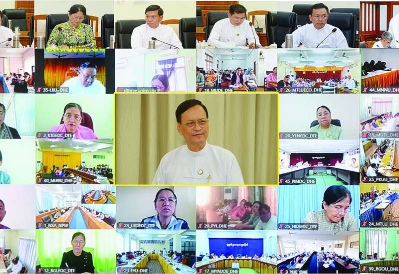 ပညာရေးဝန်ကြီးဌာန ဒုတိယဝန်ကြီး ဒေါက်တာဇော်မြင့်နှင့် တက္ကသိုလ်၊ ဒီဂရီကောလိပ်များ၏ ပါမောက္ခချုပ်များ၊ ကျောင်းအုပ်ကြီးများ၊ ဒုတိယပါမောက္ခချုပ်များ၊ ပါမောက္ခများ ညှိနှိုင်းအစည်းအဝေးကို ယနေ့မွန်းလွဲပိုင်းတွင် နေပြည်တော်ပညာရေးဝန်ကြီးဌာန ရုံးအမှတ် (၁၃) ရှိ အစည်းအဝေးခန်းမ၌ ကျင်းပရာ အဆင့်မြင့်ပညာဦးစီးဌာန၊ ဆရာအတတ်ပညာဦးစီးဌာန၊ ကျောင်းပြင်ပနှင့် တစ်သက်တာပညာရေးဦးစီးဌာနတို့မှ ညွှန်ကြားရေးမှူးချုပ်များ၊ ဒုတိယအမြဲတမ်းအတွင်းဝန်များ တက်ရောက်ကြပြီး တက္ကသိုလ်၊ ဒီဂရီကောလိပ်များမှ ပါမောက္ခချုပ်များ၊ ကျောင်းအုပ်ကြီးများ၊ ဒုတိယပါမောက္ခချုပ်များနှင့် ပါမောက္ခ၊ ဌာနမှူးများက Online ဖြင့် တက်ရောက်ကြသည်။