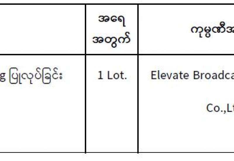 မြန်မာ့အသံနှင့်ရုပ်မြင်သံကြား၏ ၂၀၂၅-၂၀၂၆ ဘဏ္ဍာရေးနှစ်၊ စက်ပစ္စည်းများဝယ်ယူရေးအတွက် (၂၉ - ၇ - ၂၀၂၅) ရက်နေ့တွင် ပြန်ကြားရေးဝန်ကြီးဌာန၊ ပြည်တွင်း/ ပြည်ပပစ္စည်းများ ဝယ်ယူရေးနှင့်ထုခွဲရောင်းချရေးကော်မတီမှ ဈေးနှုန်းစိစစ်ခဲ့ရာ ဖော်ပြပါကုမ္ပဏီမှ ယှဉ်တွဲပါဈေးနှုန်းဖြင့် တင်ဒါအောင်မြင်ကြောင်း ကြေညာအပ်ပါသည် -