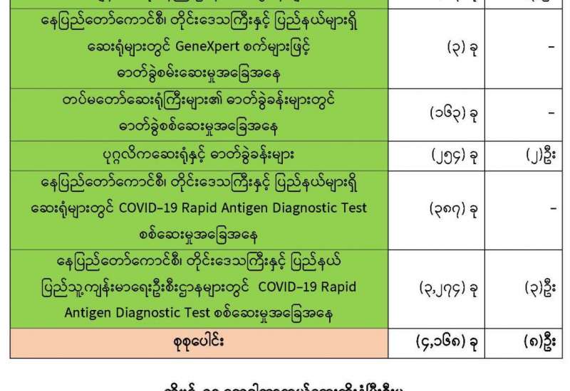 ကျန်းမာရေးဝန်ကြီးဌာနအနေဖြင့် နိုင်ငံအတွင်း ကူးစက်ဖြစ်ပွားနေသော COVID-19 ရောဂါ ကာကွယ်၊ ကုသ၊ ထိန်းချုပ်ရေးလုပ်ငန်းများကို အရှိန်အဟုန်မပြတ် ဆောင်ရွက်လျက်ရှိရာ ရောဂါ ထိန်းချုပ်ရေးလုပ်ငန်းများ အောင်မြင်နိုင်ရေးအတွက် ပြည်သူလူထုအနေဖြင့် ကျန်းမာရေးဝန်ကြီး ဌာနမှ ထုတ်ပြန်ထားသော COVID-19 ရောဂါကာကွယ်ထိန်းချုပ်ရေးဆိုင်ရာ စည်းကမ်းများကို စနစ် တကျ လိုက်နာဆောင်ရွက်ရန် လိုအပ်ပြီး COVID-19 ကာကွယ်ဆေးထိုးနှံမှုခံယူခြင်းအား အထူး ဂရုပြု ပူးပေါင်းဆောင်ရွက်ကြရန် လိုအပ်ပါသည်။