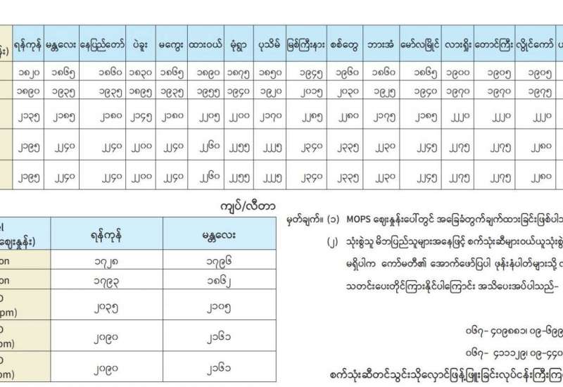 ရန်ကုန်မြို့နှင့် မန္တလေးမြို့အတွက် ရည်ညွှန်းလက်ကားဈေးနှုန်းများနှင့် ပြည်ထောင်စုနယ်မြေ နေပြည်တော်၊ တိုင်းဒေသကြီး/ပြည်နယ် မြို့တော်များအတွက် ရည်ညွှန်းလက်လီဈေးနှုန်းများ