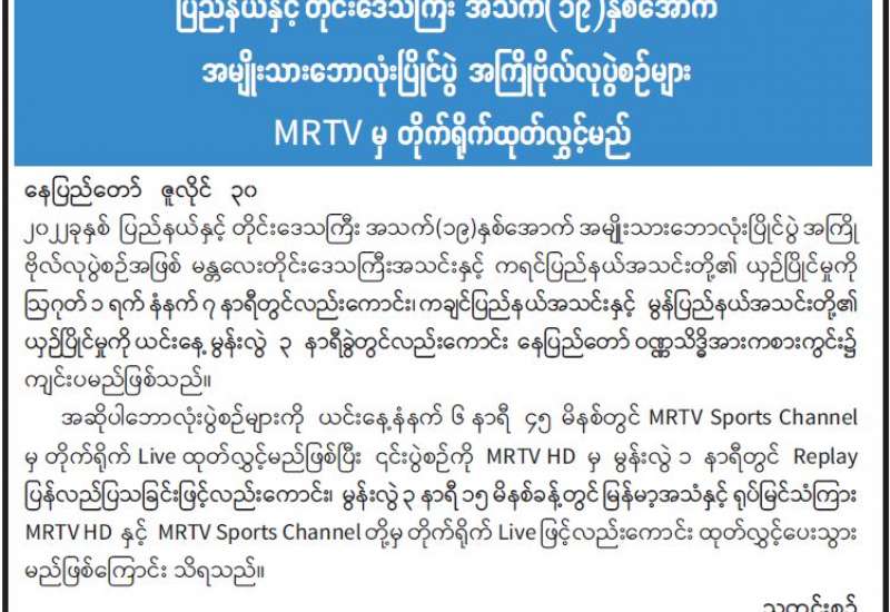 ပြည်နယ်နှင့် တိုင်းဒေသကြီး အသက်(၁၉)နှစ်အောက် အမျိုးသားဘောလုံးပြိုင်ပွဲ အကြိုဗိုလ်လုပွဲစဉ်များ MRTV မှ တိုက်ရိုက်ထုတ်လွှင့်မည်