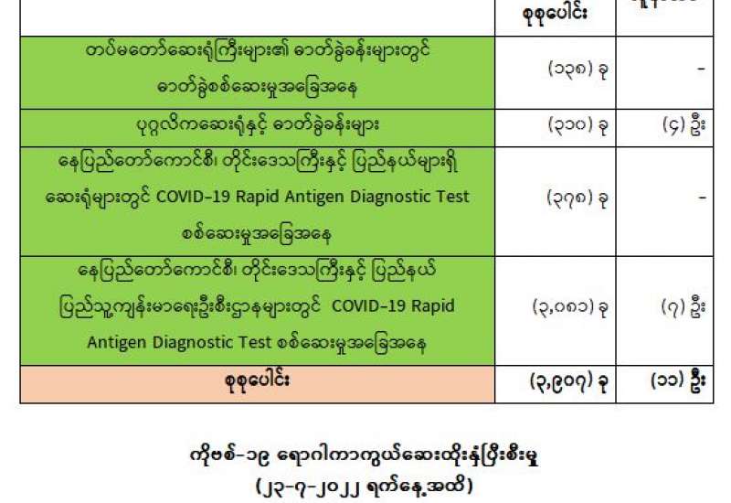 ကျန်းမာရေးဝန်ကြီးဌာနအနေဖြင့် နိုင်ငံအတွင်း ကူးစက်ဖြစ်ပွားနေသော COVID-19 ရောဂါ ကာကွယ်၊ ကုသ၊ ထိန်းချုပ်ရေးလုပ်ငန်းများကို အရှိန်အဟုန်မပြတ် ဆောင်ရွက်လျက်ရှိရာ ရောဂါ ထိန်းချုပ်ရေးလုပ်ငန်းများ အောင်မြင်နိုင်ရေးအတွက် ပြည်သူလူထုအနေဖြင့် ကျန်းမာရေးဝန်ကြီးဌာနမှ ထုတ်ပြန်ထားသော COVID-19 ရောဂါကာကွယ်ထိန်းချုပ်ရေးဆိုင်ရာ စည်းကမ်းများကို စနစ်တကျ လိုက်နာဆောင်ရွက်ရန်လိုအပ်ပြီး COVID-19 ကာကွယ်ဆေး ထိုးနှံမှုခံယူခြင်းအား အထူးဂရုပြု ပူးပေါင်းဆောင်ရွက်ကြရန် လိုအပ်ပါသည်။