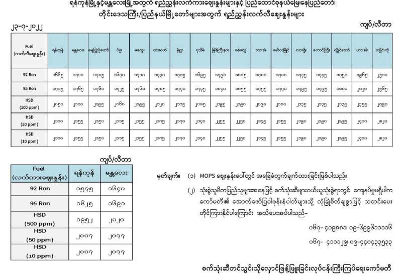ရန်ကုန်မြို့နှင့်မန္တလေးမြို့အတွက် ရည်ညွှန်းလက်ကားဈေးနှုန်းများနှင့် ပြည်ထောင်စုနယ်မြေ၊ နေပြည်တော်၊ တိုင်းဒေသကြီး/ပြည်နယ်မြို့တော်များအတွက် ရည်ညွှန်းလက်လီဈေးနှုန်းများ