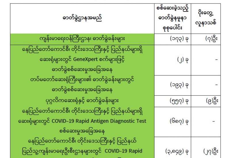 ကျန်းမာရေးဝန်ကြီးဌာနအနေဖြင့် နိုင်ငံအတွင်းကူးစက်ဖြစ်ပွားနေသော COVID-19 ရောဂါ ကာကွယ်၊ ကုသ၊ ထိန်းချုပ်ရေးလုပ်ငန်းများကို အရှိန်အဟုန်မပြတ် ဆောင်ရွက်လျက်ရှိပါသည်။