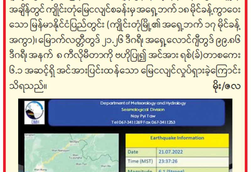 ကျိုင်းတုံမြို့အနီး အင်အားပြင်း မြေငလျင်လှုပ်