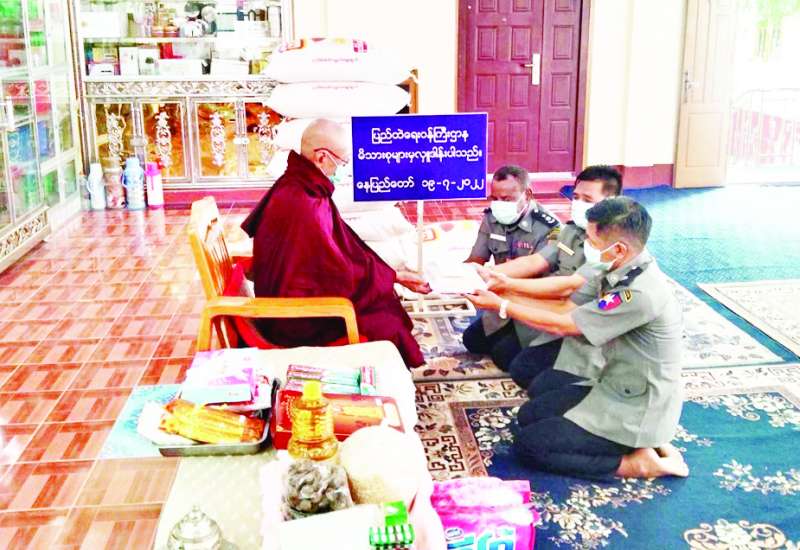 ပြည်ထဲရေးဝန်ကြီးဌာန တပ်ဖွဲ့ဝင်/ဝန်ထမ်း အရာထမ်း၊ အမှုထမ်းမိသားစုများက မြို့နယ်အသီးသီးရှိ ဘုန်းတော်ကြီးကျောင်းများသို့ ဆွမ်းဆန်တော်များ ဆက်ကပ်လှူဒါန်းလျက်ရှိသည်။