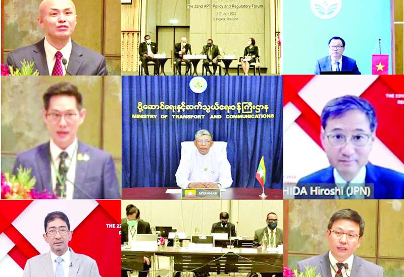 အာရှ-ပစိဖိတ် ကြေးနန်းဆက်သွယ်ရေးအဖွဲ့ (Asia Pacific Telecummunity-APT) မှ ထိုင်းနိုင်ငံဗန်ကောက်မြို့တွင် ဇူလိုင် ၁၉ ရက်မှ ၂၁ ရက်အထိ Hybrid Format ဖြင့် ကျင်းပလျက်ရှိသော “The 22ndAPT Policy and Regulatory Forum (PRF-22)” အစီအစဉ်များအတွင်း ယနေ့ကျင်းပသည့် ဝန်ကြီးအဆင့်စားပွဲဝိုင်းဆွေးနွေးပွဲသို့ ပို့ဆောင်ရေးနှင့်ဆက်သွယ်ရေးဝန်ကြီးဌာန ဒုတိယဝန်ကြီး ဗိုလ်မှူးချုပ်လူမွန်က Virtual စနစ်ဖြင့် တက်ရောက်ဆွေးနွေးသည်။