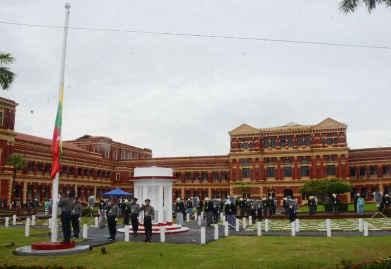 (၇၅)နှစ်မြောက်အာဇာနည်နေ့ ဝမ်းနည်းခြင်းအထိမ်းအမှတ်အဖြစ် ရန်ကုန်မြို့ ဝန်ကြီးများရုံး (ယခင်အတွင်းဝန်ရုံး)၌ နိုင်ငံတော်အလံအား တိုင်ဝက်သို့ လျှော့ချလွှင့်ထူခြင်းအခမ်းအနားကို ယနေ့နံနက်ပိုင်းက ဗိုလ်ချုပ်အောင်ဆန်းနှင့်တကွ အာဇာနည်ခေါင်းဆောင်ကြီးများ ကျဆုံးခဲ့ရာ ရန်ကုန်မြို့ ဗိုလ်တထောင်မြို့နယ်ရှိ ဝန်ကြီးများရုံး (ယခင်အတွင်းဝန်ရုံး)၌ ကျင်းပသည်။