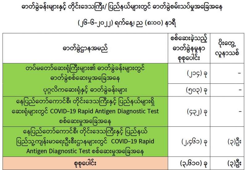 COVID-19 ရောဂါစောင့်ကြပ်ကြည့်ရှုမှုနှင့်ပတ်သက်၍ သတင်းထုတ်ပြန်ခြင်း (၂၆-၆-၂၀၂၂) ရက်နေ့၊ ည (၈:၀၀) နာရီ