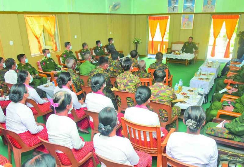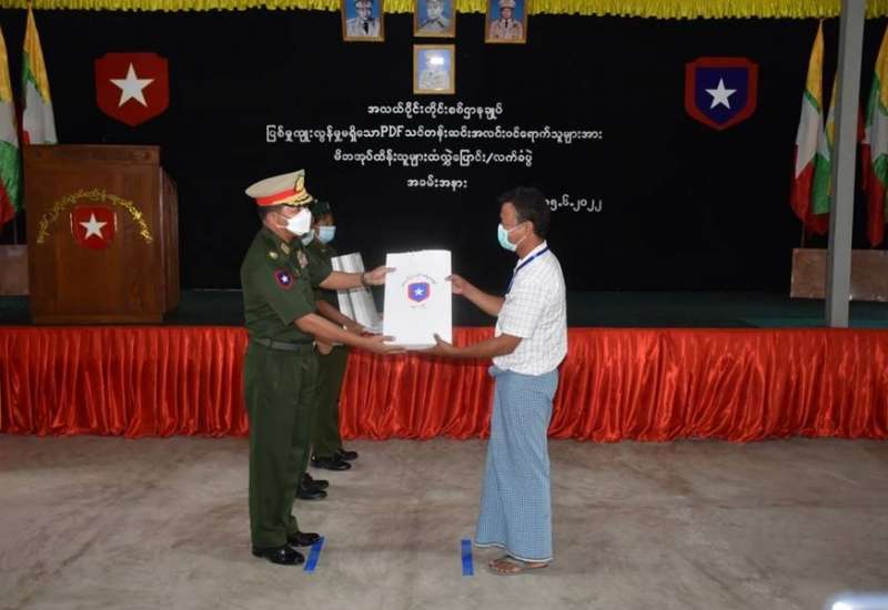 တိုင်းရင်းသား လက်နက်ကိုင်အဖွဲ့နယ်မြေအတွင်း သင်တန်းများတက်ရောက်ခဲ့ပြီး ပြစ်မှုကျူးလွန်ခြင်း မရှိခဲ့သည့် ဥပဒေဘောင်အတွင်း ဝင်ရောက်လာသော မန္တလေးတိုင်းဒေသကြီးအတွင်းမှ PDF အဖွဲ့ဝင်များအား ၎င်းတို့၏ မိဘအုပ်ထိန်းသူများထံသို့ ထပ်မံလွှဲပြောင်းပေးအပ်ခြင်းကို ယနေ့နံနက်ပိုင်းတွင် အလယ်ပိုင်းတိုင်းစစ်ဌာနချုပ်၊ နယ်မြေခံ သင်တန်းကျောင်းခန်းမ၌ ပြုလုပ်ရာ တိုင်းစစ်ဌာနချုပ်မှ တာဝန်ရှိသူများ၊ တိုင်းဒေသကြီးအစိုးရအဖွဲ့နှင့် တပ်ရင်း/ တပ်ဖွဲ့များမှ တာဝန်ရှိသူများ၊ ဥပဒေဘောင်အတွင်း ဝင်ရောက်လာသူများနှင့် ၎င်းတို့၏ မိဘအုပ်ထိန်းသူများ တက်ရောက်ကြသည်။