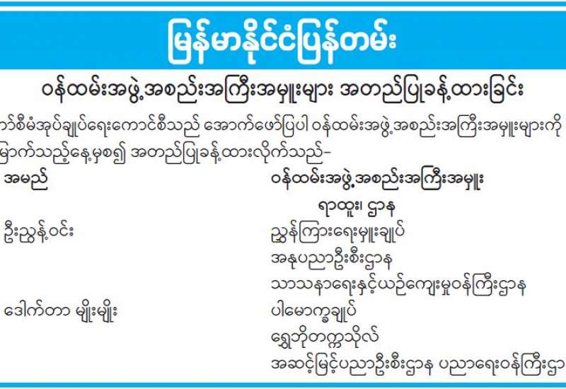 နိုင်ငံ့ဝန်ထမ်းအကြီးအမှူးများအတွက် ဥပဒေအသိပညာပြန့်ပွားရေးသင်တန်း အမှတ်စဉ်(၁) သင်တန်းဖွင့်ပွဲ အခမ်းအနားကို ယနေ့နံနက်ပိုင်းတွင် ဥပဒေရေးရာဝန်ကြီးဌာန မြေညီထပ် အစည်းအဝေးခန်းမ၌ ကျင်းပသည်။