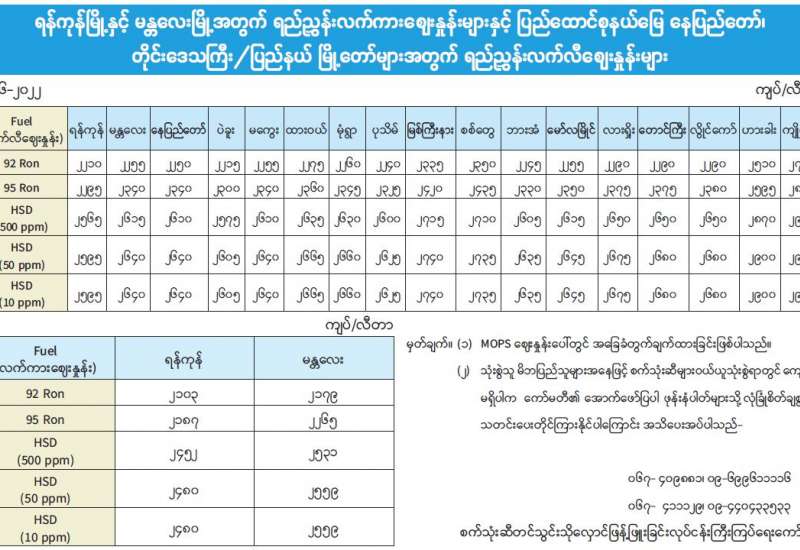 ရန်ကုန်မြို့နှင့် မန္တလေးမြို့အတွက် ရည်ညွှန်းလက်ကားဈေးနှုန်းများနှင့် ပြည်ထောင်စုနယ်မြေ နေပြည်တော်၊ တိုင်းဒေသကြီး/ပြည်နယ် မြို့တော်များအတွက် ရည်ညွှန်းလက်လီဈေးနှုန်းများ