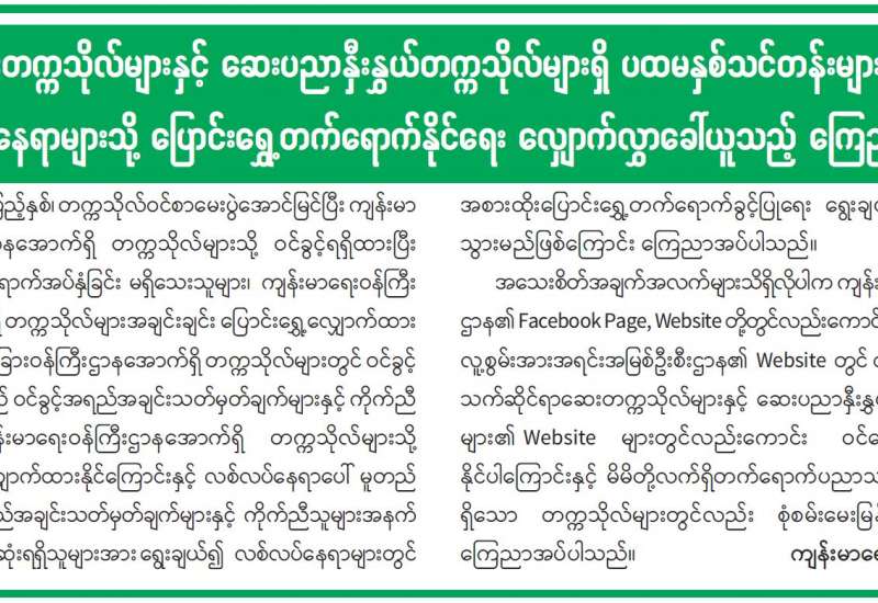 ဆေးတက္ကသိုလ်များနှင့် ဆေးပညာနှီးနွှယ်တက္ကသိုလ်များရှိ ပထမနှစ်သင်တန်းများ၏ လစ်လပ်နေရာများသို့ ပြောင်းရွှေ့တက်ရောက်နိုင်ရေး လျှောက်လွှာခေါ်ယူသည့် ကြေညာချက်