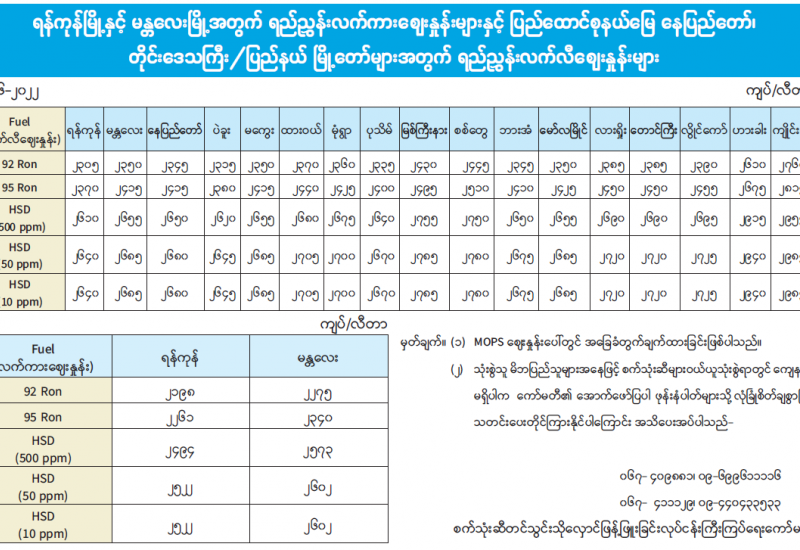 ရန်ကုန်မြို့နှင့် မန္တလေးမြို့အတွက် ရည်ညွှန်းလက်ကားဈေးနှုန်းများနှင့် ပြည်ထောင်စုနယ်မြေ နေပြည်တော်၊ တိုင်းဒေသကြီး/ ပြည်နယ် မြို့တော်များအတွက် ရည်ညွှန်းလက်လီဈေးနှုန်းများ