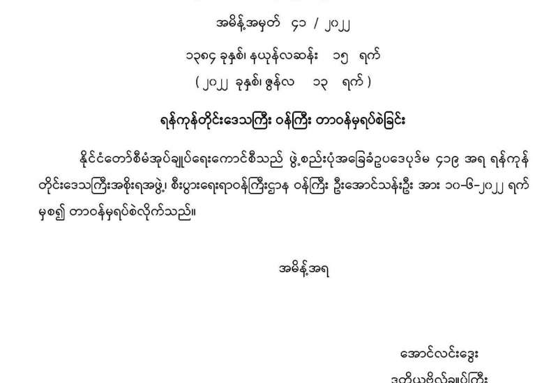 တိုင်းဒေသကြီးအစိုးရအဖွဲ့၊ စီးပွားရေးရာဝန်ကြီးဌာန ဝန်ကြီး ဦးအောင်သန်းဦး အား ၁၀-၆-၂၀၂၂ ရက် မှစ၍ တာဝန်မှရပ်စဲ