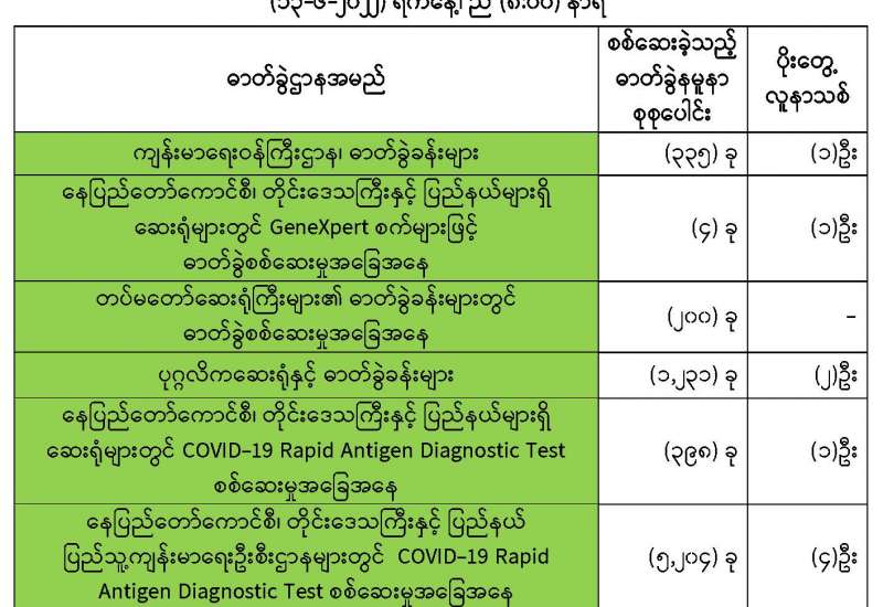 ကျန်းမာရေးဝန်ကြီးဌာနအနေဖြင့် နိုင်ငံအတွင်း ကူးစက်ဖြစ်ပွားနေသော COVID-19 ရောဂါ ကာကွယ်၊ ကုသ၊ ထိန်းချုပ်ရေးလုပ်ငန်းများကို အရှိန်အဟုန်မပြတ် ဆောင်ရွက်လျက်ရှိပါသည်။