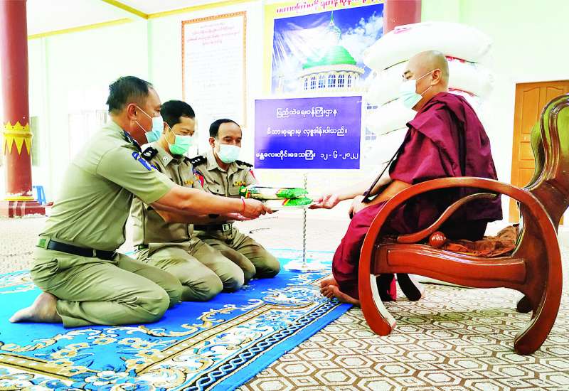 ပြည်ထဲရေးဝန်ကြီးဌာန တပ်ဖွဲ့ဝင်/ဝန်ထမ်း အရာထမ်း၊ အမှုထမ်းမိသားစုများက မြို့နယ်အသီးသီးရှိ ဘုန်းတော်ကြီးကျောင်းများသို့ ဆွမ်းဆန်တော်များ ဆက်ကပ် လှူဒါန်းလျက်ရှိသည်။