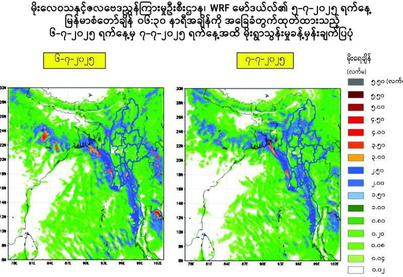 ယနေ့ညနေ ၅ နာရီခွဲ တိုင်းထွာချက်များအရ ကပ္ပလီပင်လယ်ပြင်နှင့် ဘင်္ဂလားပင်လယ်အော်တို့တွင် မုတ်သုံလေအားအသင့်အတင့်မှ အားကောင်းနေခြင်းကြောင့်လည်းကောင်း၊ အရှေ့ဘက်မှ ရွေ့လျားလာသော လေပွေလှိုင်းများ၏အရှိန်ကြောင့် လည်းကောင်း၊ အနောက်ဘက်မှ ရွေ့လျားလာသော လေပွေလှိုင်းများ၏အရှိန်ကြောင့် လည်းကောင်း ယနေ့ညမှ ဇူလိုင် ၇ ရက်အတွင်း မန္တလေးတိုင်းဒေသကြီး၊ မကွေးတိုင်းဒေသကြီး၊ စစ်ကိုင်းတိုင်းဒေသကြီးအောက်ပိုင်းနှင့် ကယားပြည်နယ်တို့တွင် နေရာကျဲကျဲနှင့် နေပြည်တော်၊ ရန်ကုန်တိုင်းဒေသကြီး၊ ပဲခူးတိုင်းဒေသကြီး၊ စစ်ကိုင်းတိုင်းဒေသကြီးအထက်ပိုင်း၊ ဧရာဝတီတိုင်းဒေသကြီး၊ တနင်္သာရီတိုင်းဒေသကြီး၊ ကချင်ပြည်နယ်၊ ကရင်ပြည်နယ်၊ ချင်းပြည်နယ်၊ မွန်ပြည်နယ်၊ ရခိုင်ပြည်နယ်နှင့် ရှမ်းပြည်နယ်တို့တွင် နေရာစိပ်စိပ်မှ နေရာအနှံ့အပြား မိုးထစ်ချုန်းရွာပြီး အချို့ဒေသများတွင် ဒေသအလိုက်နှင့် နေရာကွက်၍ မိုးကြီးမည်။ မြစ်ဝကျွန်းပေါ်၊ ရခိုင်ကမ်းရိုးတန်း တစ်လျှောက်နှင့် ကမ်းလွန်ပင်လယ်ပြင်တို့တွင် ရံဖန်ရံခါ မိုးသက်လေပြင်းများကျရောက်ပြီး လှိုင်းကြီးမည်။ မိုးသက် လေပြင်းကျစဉ်ရေပြင်၊ မြေပြင်လေသည် တစ်နာရီ လျှင် ၃၅ မိုင်အထိ တိုက်ခတ်နိုင်သည်။ လှိုင်းအမြင့်မှာ မြစ်ဝကျွန်းပေါ်၊ ရခိုင်ကမ်းရိုးတန်းတစ်လျှောက်နှင့် ကမ်းလွန်ပင်လယ်ပြင်တို့တွင် ၁၁ ပေ မှ ၁၃ ပေ ခန့်ရှိနိုင်သည်။ မုတ္တမကွေ့၊ မွန်-တနင်္သာရီကမ်းရိုး တန်းတစ်လျှောက်နှင့် ကမ်းလွန်ပင်လယ်ပြင်တို့တွင် တစ်ခါတစ်ရံ မိုးသက်လေပြင်းများကျရောက်ပြီး လှိုင်းအသင့်အတင့်မှ လှိုင်းကြီးနိုင်သည်။ မိုးသက်လေပြင်းကျစဉ်ရေပြင်၊ မြေပြင်လေသည် တစ်နာရီလျှင် ၂၅ မိုင်မှ မိုင် ၃၀ အထိ တိုက်ခတ်နိုင်သည်။ လှိုင်းအမြင့်မှာ မုတ္တမကွေ့၊ မွန်-တနင်္သာရီကမ်းရိုးတန်းတစ်လျှောက်နှင့် ကမ်းလွန်ပင်လယ်ပြင်တို့တွင် ခုနစ်ပေမှ ကိုးပေခန့် ရှိနိုင်သည်။