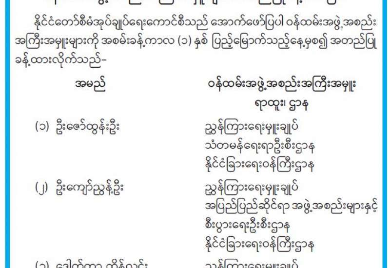 ဝန်ထမ်းအဖွဲ့အစည်းအကြီးအမှူးများ အတည်ပြုခန့်ထားခြင်း