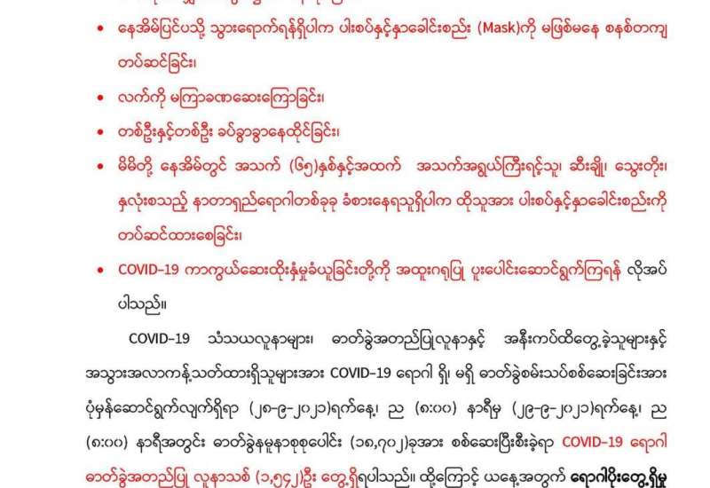 ကိုဗစ်-၁၉ ရောဂါ ကာကွယ်၊ ထိန်းချုပ်၊ ကုသရေး ဆောင်ရွက်ရာတွင် ကာကွယ်ဆေးထိုးနှံခြင်းသည် အဓိကအခန်းကဏ္ဍတွင် ပါဝင်သည့် လုပ်ငန်း တစ်ရပ်ဖြစ်သောကြောင့် ကိုဗစ်-၁၉ ရောဂါ ကာကွယ်ဆေးထိုးနှံမှုကို တိုင်းဒေသကြီး နှင့် ပြည်နယ်အသီးသီးတို့၌ တပ်မတော်မှ ဆေးအဖွဲ့များ၊ ပြည်သူ့ဆေးရုံများမှ ဆရာဝန်များ၊ သူနာပြုများ၊ ကျန်းမာရေးဝန်ထမ်းများနှင့် စေတနာ့ဝန်ထမ်းများက ကာကွယ်ဆေးထိုးခြင်းလုပ်ငန်းများကို အင်တိုက်အားတိုက် ဆောင်ရွက်ပေးလျက်ရှိ သည်။