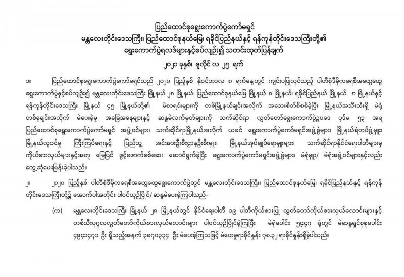 ၁။ ပြည်ထောင်စုရွေးကောက်ပွဲကော်မရှင်သည် ၂၀၂၀ ပြည့်နှစ် နိုဝင်ဘာလ ၈ ရက်နေ့တွင် ကျင်းပပြုလုပ်သည့် ပါတီစုံဒီမိုကရေစီ အထွေထွေရွေးကောက်ပွဲနှင့်စပ်လျဉ်း၍ ပဲခူးတိုင်း ဒေသကြီး မြို့နယ် ၂၈ မြို့နယ်၊ မကွေးတိုင်းဒေသကြီး မြို့နယ် ၂၅ မြို့နယ်၊ ရှမ်းပြည်နယ် မြို့နယ် ၄၉ မြို့နယ်နှင့် ဧရာဝတီတိုင်း ဒေသကြီး မြို့နယ် ၂၆ မြို့နယ်တို့၏ မဲစာရင်းများကို တစ်မြို့နယ်ချင်းအလိုက် အသေးစိတ်စိစစ်ခဲ့ပြီး မြို့နယ်အသီးသီးရှိ မဲရုံတစ်ခုချင်းအလိုက် မဲပေးခဲ့မှုအခြေအနေများနှင့် ဆန္ဒမဲလက်မှတ်များကိုသက်ဆိုင်ရာ လွှတ်တော်ရွေးကောက်ပွဲ ဥပဒေ ပုဒ်မ ၅၃ အရ ပြည်ထောင်စုရွေးကောက်ပွဲ ကော်မရှင်အဖွဲ့ဝင်များ၊ သက်ဆိုင်ရာ မြို့နယ်အလိုက် ယခင်ရွေးကောက်ပွဲကော်မရှင်အဖွဲ့ခွဲများ၊ မြို့နယ်ရဲတပ်ဖွဲ့မှူး၊ မြို့နယ် လူဝင်မှုကြီးကြပ်ရေးနှင့် ပြည်သူ့အင်အားဦးစီးဌာနဦးစီးမှူး၊ မြို့နယ်အုပ်ချုပ်ရေးမှူးများ၊ သက်ဆိုင်ရာ နိုင်ငံရေးပါတီများမှ ကိုယ်စားလှယ်များနှင့် အတူမြေပြင်ဖွင့်ဖောက်စစ်ဆေး ဆောင်ရွက်ခဲ့ပြီး ရွေးကောက်ပွဲ ကော်မရှင်အဖွဲ့ခွဲများ၊ မဲရုံမှူး/ မဲရုံ အဖွဲ့ ဝင်များနှင့်လည်း တွေ့ဆုံမေးမြန်းခဲ့ပါသည်။