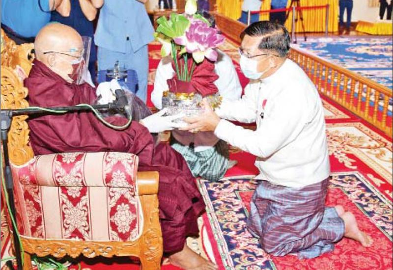 ပြည်ထောင်စုသမ္မတမြန်မာနိုင်ငံတော်၊ နိုင်ငံတော်စီမံအုပ်ချုပ်ရေးကောင်စီ၏ ၂၀၂၁ ခုနှစ်၊ ဝါဆိုသင်္ကန်းဆက်ကပ်လှူဒါန်းပွဲ မင်္ဂလာအခမ်းအနားကို ယနေ့နံနက်ပိုင်း တွင် နေပြည်တော် ကောင်စီနယ်မြေ၊ ဥပ္ပါတသန္တိစေတီတော်မြတ်ကြီးပရိဝုဏ်တော် အတွင်းရှိ သာသနာ့မဟာ ဗိမာန်တော်ကြီး၌ ကျင်းပပြုလုပ်ရာ နိုင်ငံတော်စီမံအုပ်ချုပ်ရေး ကောင်စီဥက္ကဋ္ဌ တပ်မတော် ကာကွယ်ရေးဦးစီးချုပ် ဗိုလ်ချုပ်မှူးကြီး မင်းအောင်လှိုင် က ဝါဆိုသင်္ကန်း၊ လှူဖွယ်ပစ္စည်း များနှင့် ဆွမ်း၊ ခဲဖွယ်၊ ဘောဇဉ် တို့ကို ဆက်ကပ်လှူဒါန်း သည်။