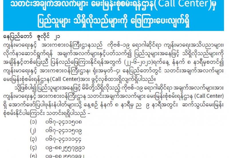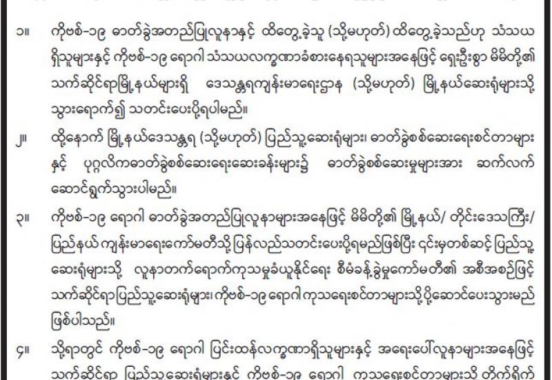 နိုင်ငံတစ်ဝန်းလုံးအတိုင်းအတာဖြင့် နေပြည်တော်ကောင်စီအပါအဝင် တိုင်းဒေသကြီး၊ ပြည်နယ်အသီးသီးမှ စေတနာ့ဝန်ထမ်းများအတွက် ကိုဗစ်-၁၉ ရောဂါ ကာကွယ်၊ထိန်းချုပ် တုံ့ပြန်ရေး လုပ်ငန်းစဉ်များနှင့်ပတ်သက်ပြီး လုပ်ငန်းဆိုင်ရာကျွမ်းကျင်မှုသင်တန်းကို အွန်လိုင်း စနစ်ဖြင့် ယနေ့နံနက် ၉ နာရီခွဲတွင် ကျင်းပသည်။