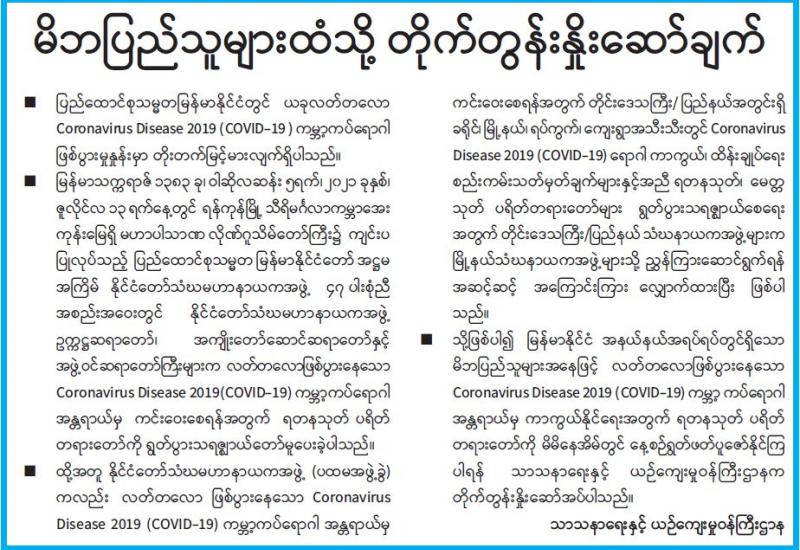 ကိုဗစ်-၁၉ ရောဂါကို အကြောင်းပြု၍ ဈေးနှုန်းမြင့်တက်ခြင်း၊ ကုန်ပစ္စည်းပြတ်လပ်ခြင်းတို့ ဖြစ်ပေါ်သည့်ထဲတွင် ကြက်ဥလည်း ပါဝင်သည်။ ရောဂါကာကွယ်ရေးအတွက် ကိုယ်ခံစွမ်းအားကောင်းရန် လိုအပ်သည်ဖြစ်ရာ ကြက်ဥတစ်မယ်မျှဖြင့် ကိုယ်ခံအားကောင်းမွန် ရေးကို ပြည့်စုံစေသည်မဟုတ်ကြောင်း ပညာပေးမှုများ ပြုလုပ်လျက် ရှိသည်ကိုလည်း သတိမူကြရန်လိုသည်။