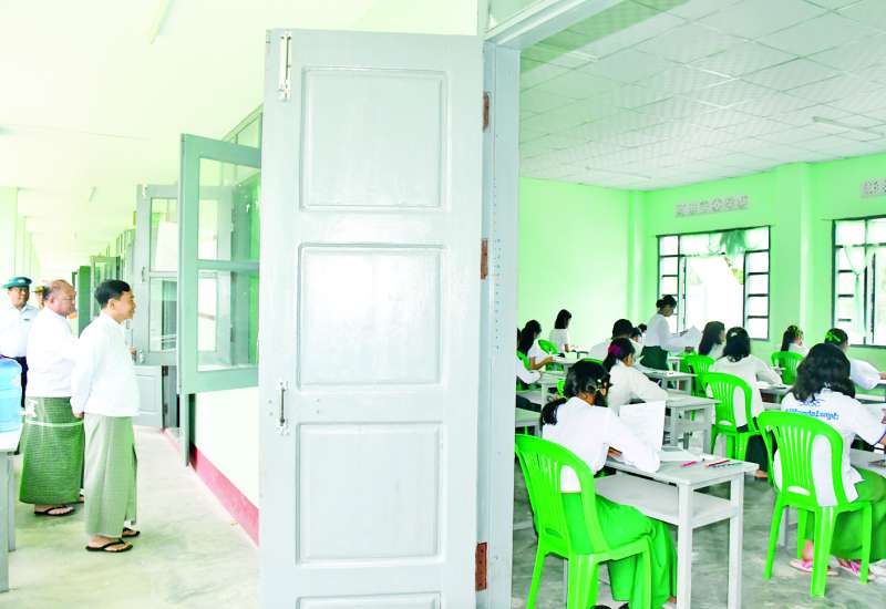 ပညာရေးဝန်ကြီးဌာန ပြည်ထောင်စုဝန်ကြီး ဒေါက်တာညွန့်ဖေသည် ဒုတိယဝန်ကြီး ဒေါက်တာဇော်မြင့်နှင့် ဦးနေမျိုးလှိုင်၊ ဌာနဆိုင်ရာတာဝန်ရှိသူများနှင့်အတူ ယနေ့နံနက်ပိုင်းတွင် ဇမ္ဗူသီရိမြို့နယ် အမှတ်(၆) အခြေခံပညာအထက်တန်းကျောင်း စာစစ်ဌာန၌ ကျောင်းသား ကျောင်းသူများ တက္ကသိုလ်ဝင်စာမေးပွဲ ဒုတိယနေ့ အင်္ဂလိပ်စာဘာသာရပ် အေးချမ်းစွာဖြေဆိုနေမှုကို လှည့်လည်ကြည့်ရှုအားပေးသည်။