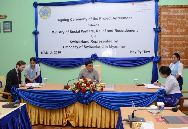 လူမှုဝန်ထမ်း၊ ကယ်ဆယ်ရေးနှင့် ပြန်လည်နေရာချထားရေးဝန်ကြီးဌာနနှင့် ဆွစ်ဇာလန် နိုင်ငံအစိုးရ ကိုယ်စားပြု မြန်မာနိုင်ငံဆိုင်ရာ ဆွစ်ဇာလန်သံရုံးတို့အကြား ရှမ်းပြည်နယ် တောင်ပိုင်း၊ လူမှုအဆောက်အဦများ တည်ဆောက်ခြင်းနှင့် ရပ်ရွာဖွံ့ဖြိုးတိုးတက်ရေး စီမံကိန်း အကောင်အထည်ဖော်ရေး သဘောတူလက်မှတ်ရေးထိုးပွဲ အခမ်းအနားကို ယမန်နေ့ညနေ ၅ နာရီခွဲက အဆိုပါဝန်ကြီးဌာန၏ အစည်းအဝေး ခန်းမ၌ ကျင်းပသည်။