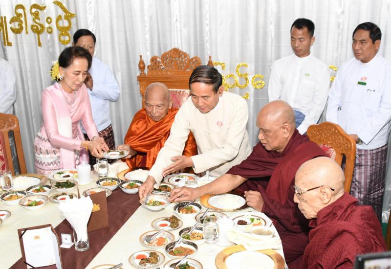 နိုင်ငံတော်သံဃမဟာနာယက ဆရာတော်ကြီးများ၊ တိပိဋကဓရ တိပိဋက ကောဝိဒ ဆရာတော်များနှင့် ၂၀၂၀ ပြည့်နှစ်၊ သာသနာတော်ဆိုင်ရာ ဘွဲ့တံဆိပ်တော် ဆက်ကပ်ခံယူမည့် ဆရာတော်များအား ပြည်ထောင်စုသမ္မတမြန်မာနိုင်ငံတော်အစိုးရက နေ့ဆွမ်း ဆက်ကပ်လှူဒါန်းပွဲ အခမ်းအနားကို ယနေ့နံနက် ၉ နာရီခွဲတွင် နေပြည်တော် ဥပ္ပါတသန္တိ စေတီတော် ပရိဝုဏ်အတွင်းရှိ သာသနာ့မဟာဗိမာန်တော်ကြီး၌ ကျင်းပရာ နိုင်ငံတော် သမ္မတ ဦးဝင်းမြင့်နှင့်ဇနီး ဒေါ်ချိုချို၊ နိုင်ငံတော်၏အတိုင်ပင်ခံပုဂ္ဂိုလ် ဒေါ်အောင်ဆန်းစုကြည် တို့ တက်ရောက်ကြည်ညိုပြီး နေ့ဆွမ်းဆက်ကပ် လှူဒါန်းကြသည်။